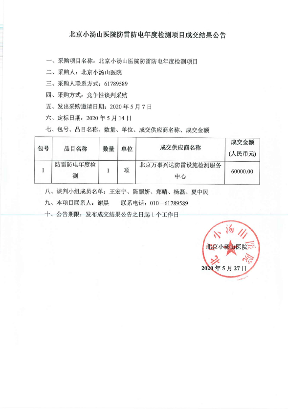 北京小汤山医院防雷防电年度检测项目成交结果公告