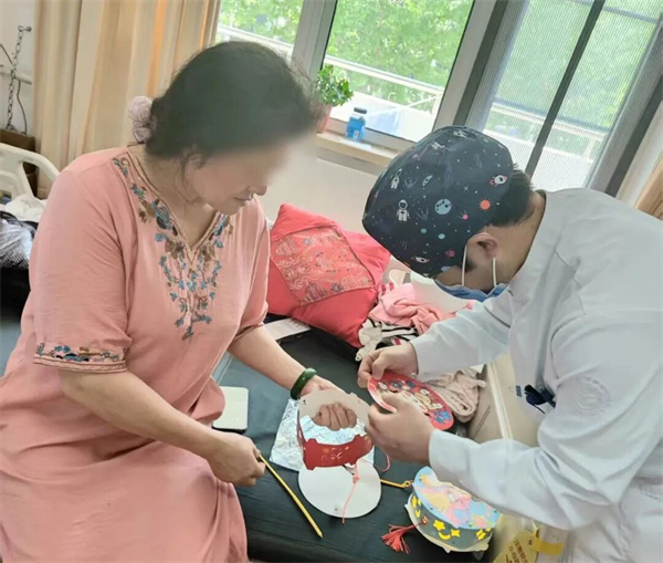 责任护士曹鹏飞走进病房,与家属一起为患者做小灯笼,房间里有曹护士的轻声指导还有制作灯笼时患者的笑意。当暖黄的灯光透过两人共同完成的灯笼亮起,映在患者眼里的不只是光亮,更是被看见、被陪伴的安心——原来治愈从不只靠药物,这份一起动手的小温暖,早已成了心底最柔软的光。