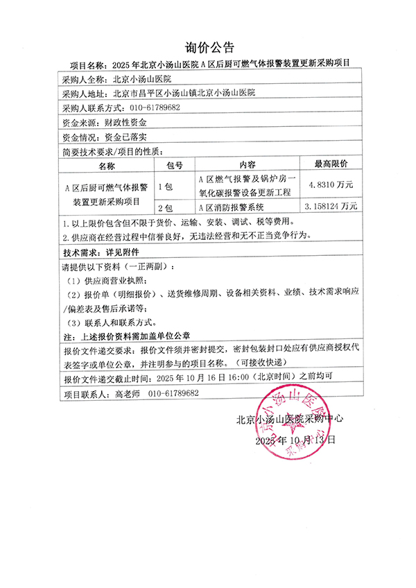 2025年北京小汤山医院A区后厨可燃气体报警装置更新采购项目询价公告