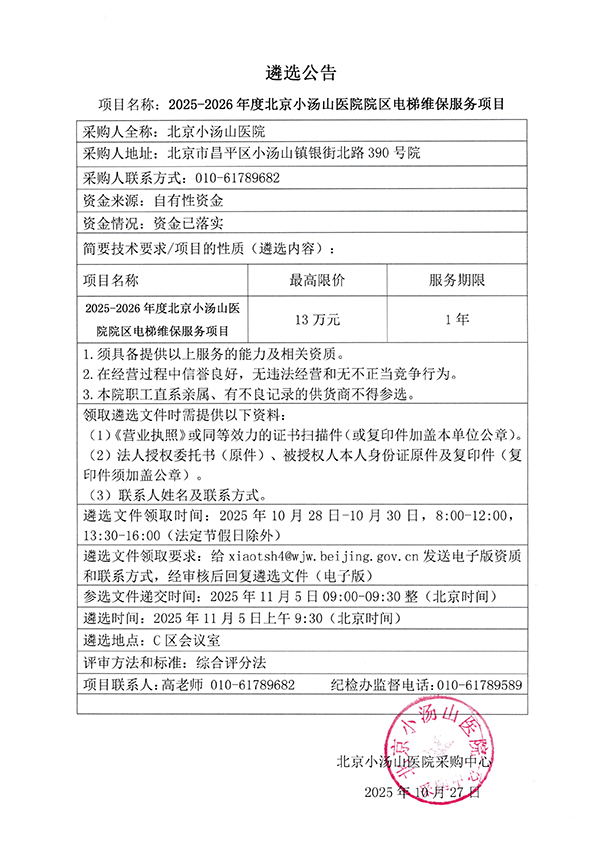 2025-2026年度北京小汤山医院院区电梯维保服务项目遴选公告