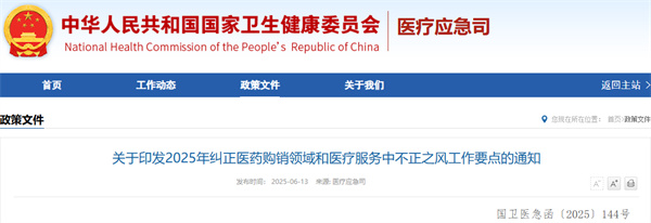 为严格落实二十届中央纪委四次全会要求,巩固深化拓展全国医药领域腐败问题集中整治成效,统筹开展群众身边不正之风和腐败问题集中整治,切实做好2025年纠正医药购销领域和医疗服务中不正之风工作,国家卫生健康委、教育部、工业和信息化部、公安部、财政部、商务部、审计署、国务院国资委、国家税务总局、国家市场监管总局、国家医保局、国家中医药局、国家疾控局、国家药监局等全国纠正医药购销领域和医疗服务中不正之风部际联席工作机制(下称“纠风部际机制”)14部委联合制定印发了《关于印发2025年纠正医药购销领域和医疗服务中不正之风工作要点的通知》(国卫医急函〔2025〕144号,以下简称“《通知》”)。