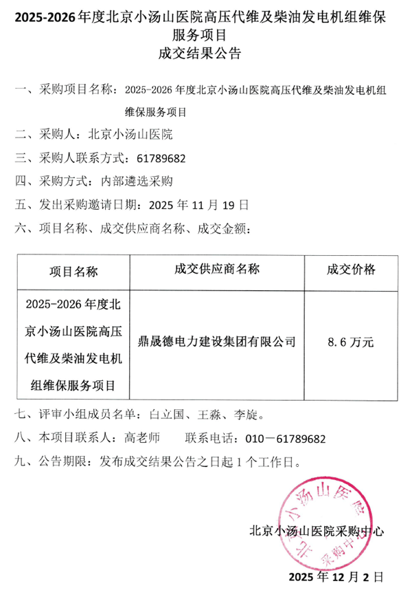 2025-2026年北京小汤山医院高压代维及柴油发电机组维保项目成交公告