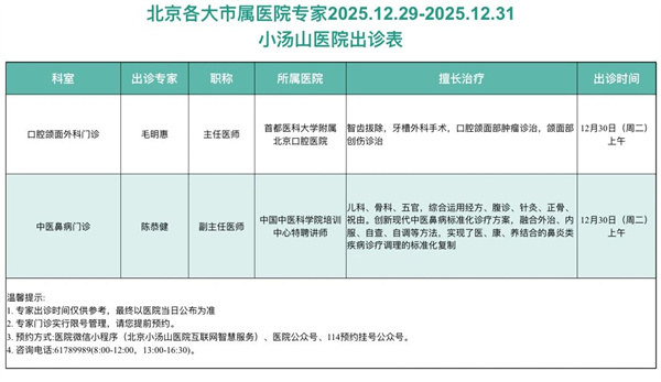 北京各大市属医院专家2025.12.29-2025.12.31小汤山医院出诊表