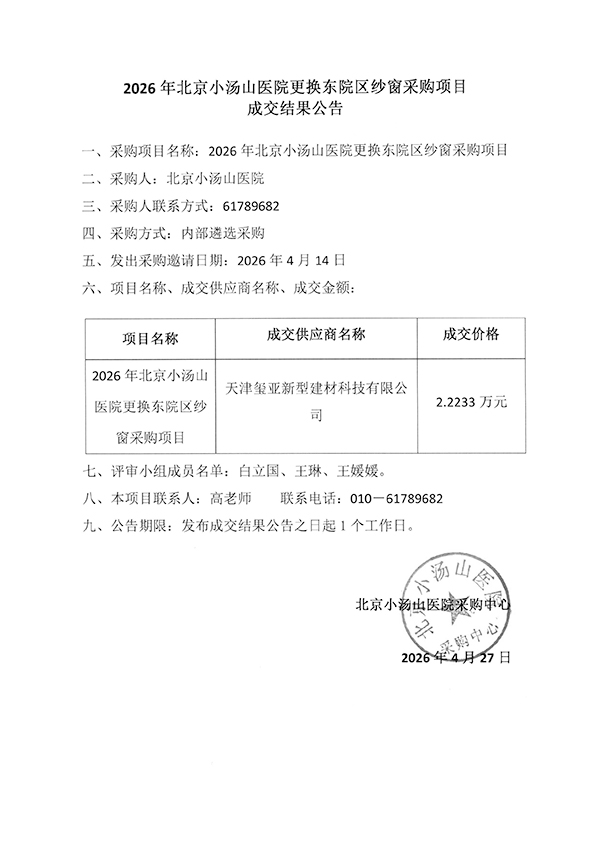 2026年北京小汤山医院更换东院区纱窗采购项目成交结果公告